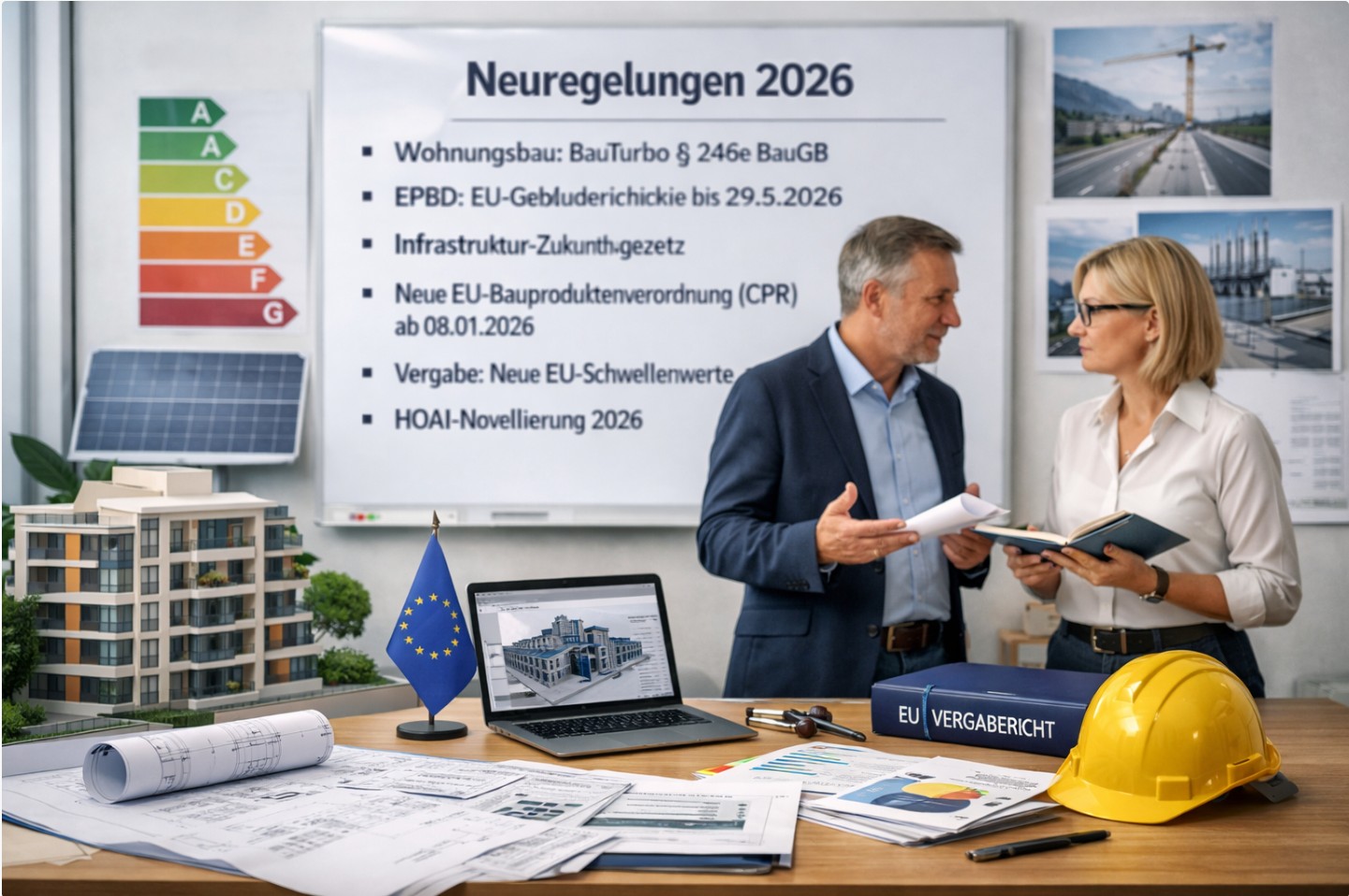 2026 wird für Architekten, Ingenieure und Projektsteuerer zum Jahr der Umstellung: Mehr Tempo bei Genehmigungen, neue Vorgaben rund um Energieeffizienz und Sanierung, aktualisierte Regeln für Bauprodukte sowie veränderte Rahmenbedingungen in der Vergabe. Für viele Büros heißt das: Prozesse, Leistungsbilder und Dokumentation müssen noch sauberer organisiert werden – und zwar entlang klarer Stichtage.