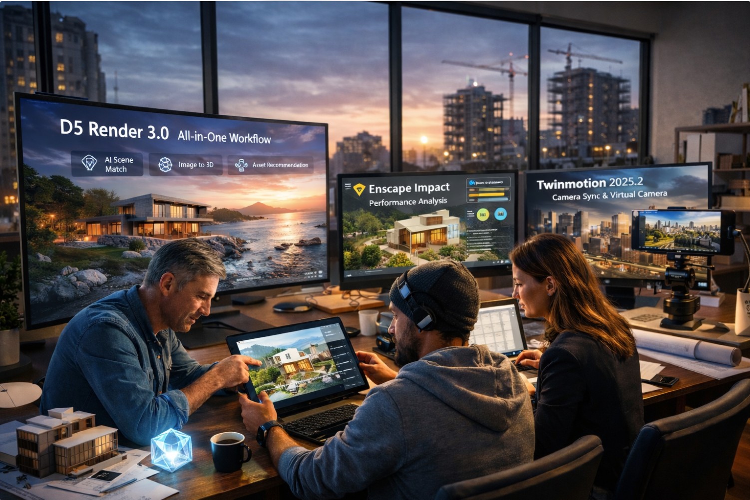 Der Markt für Echtzeit-Rendering und ArchViz im Planungsumfeld entwickelt sich spürbar weiter: Anbieter koppeln Visualisierung enger an Entwurf, Koordination und Analyse – und verankern KI-Funktionen zunehmend direkt im Tool-Workflow. Drei aktuelle Bausteine zeigen die Richtung: D5 Render 3.0 (mit „All-in-One Workflow“ und generativen KI-Modulen), Enscape 4.1 (mit Performance-Add-on „Impact“ und Chaos-Cloud-Ökosystem) sowie Twinmotion 2025.2 (mit Camera-Sync und Virtual-Camera-Anbindung).