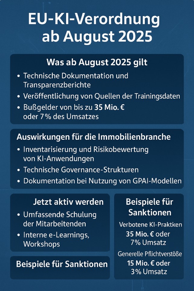 Ab dem 2. August 2025 gelten europaweit umfassende Vorschriften für den Einsatz künstlicher Intelligenz. Die EU-KI-Verordnung sieht vor, dass Anbieter und Nutzer von KI-Systemen – insbesondere auch in der Immobilienwirtschaft – zahlreiche neue Anforderungen erfüllen müssen.